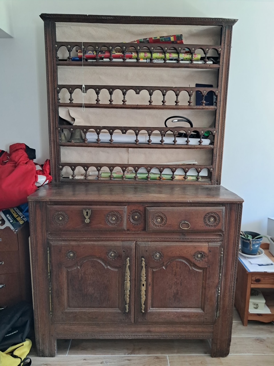 Il s’agit d’un buffet ancien en bois massif, composé d’un corps bas avec portes et tiroirs, surmonté d’un vaisselier ouvert.
