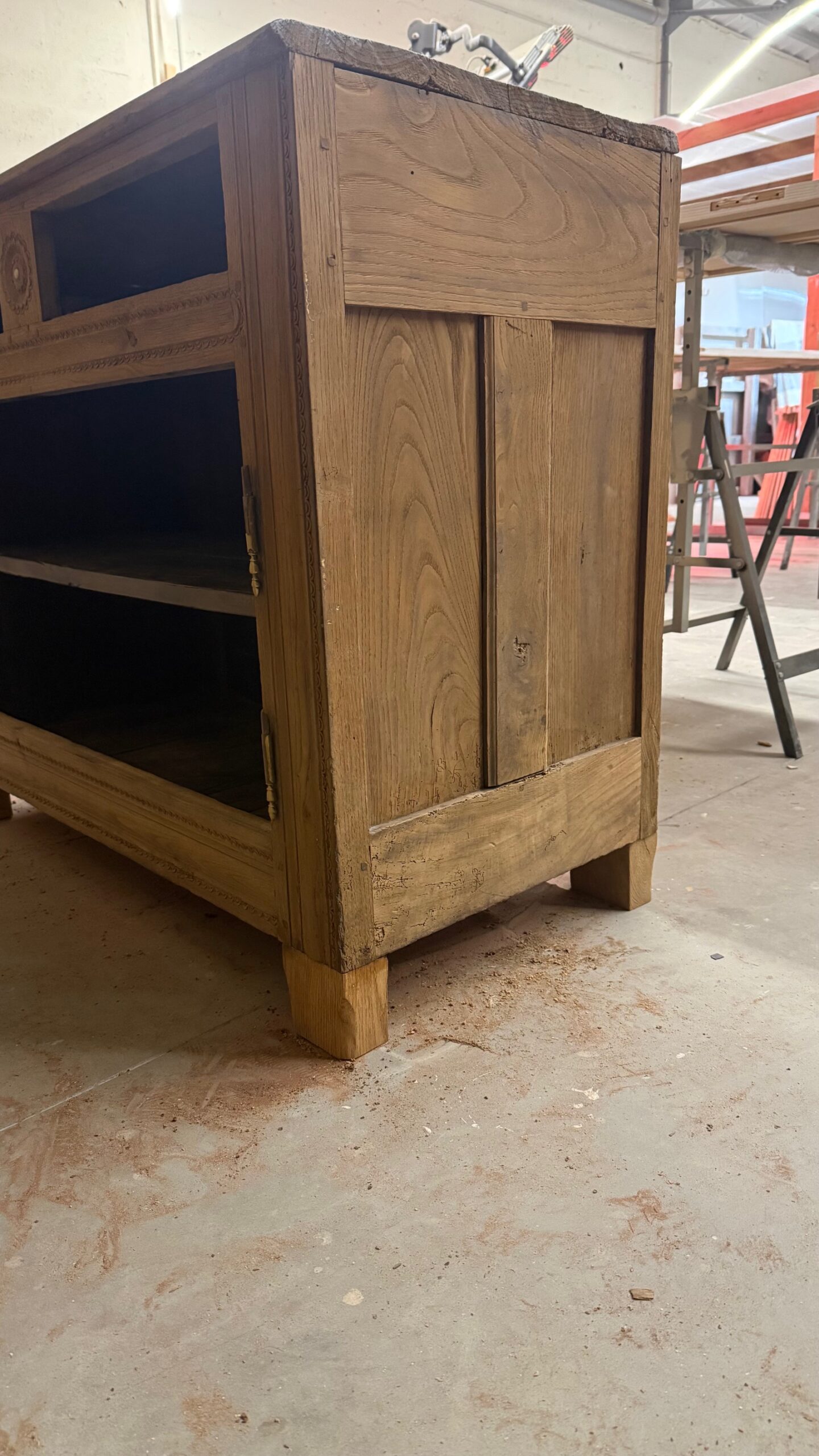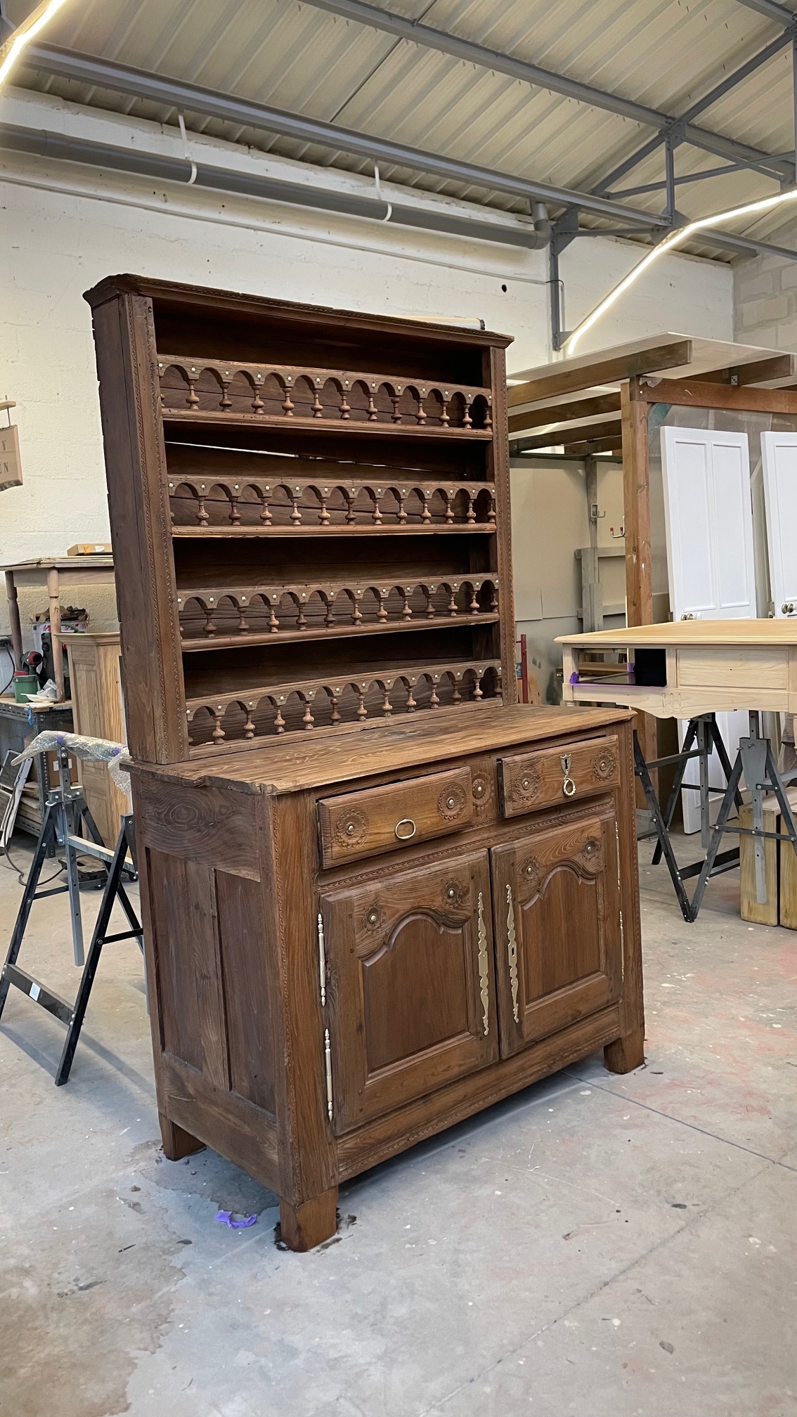 Après restauration, ce buffet ancien a retrouvé tout son caractère. Le bois massif est mis en valeur, les détails décoratifs sont visibles et le meuble est désormais prêt à être utilisé pour de nombreuses années.