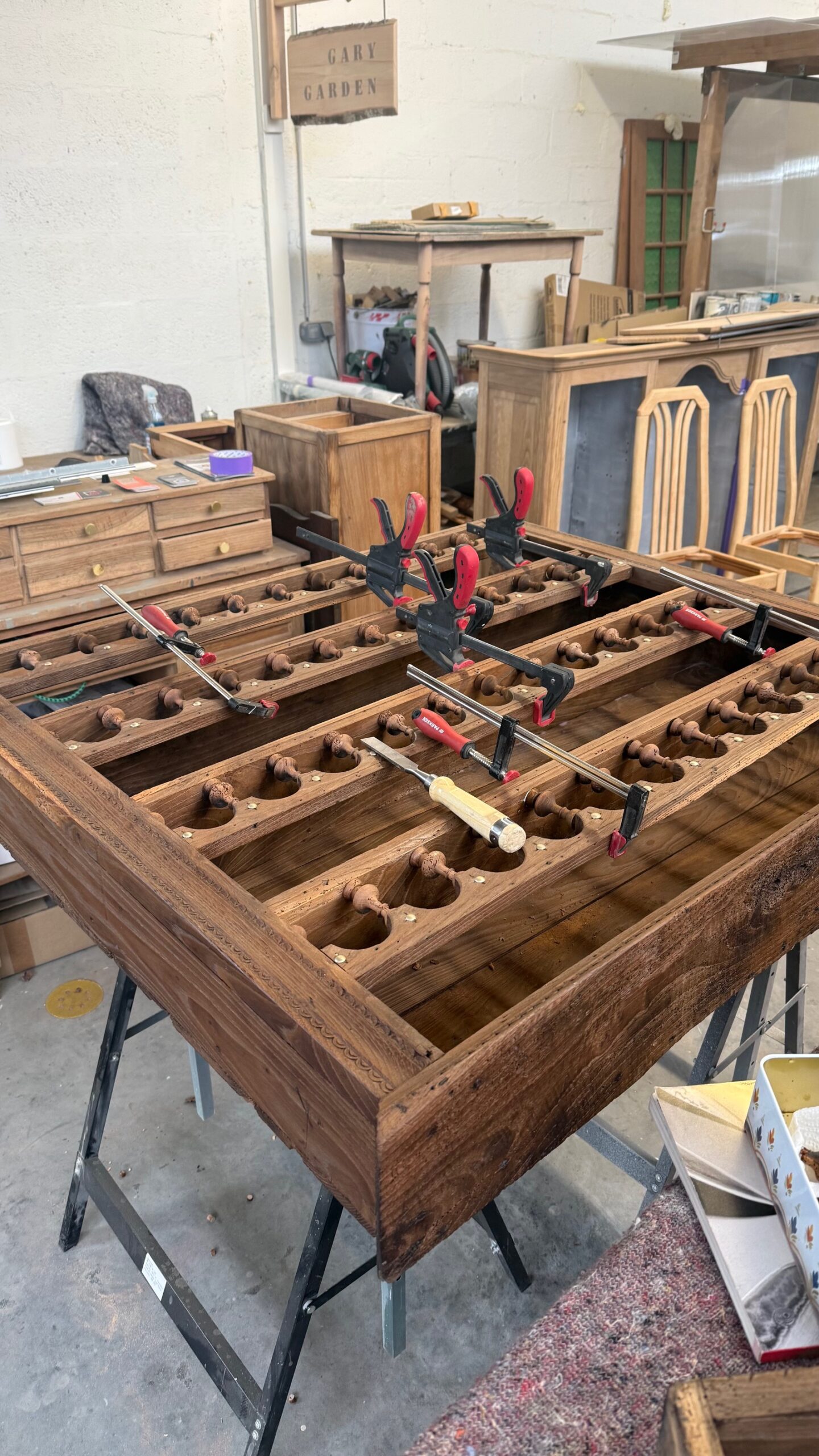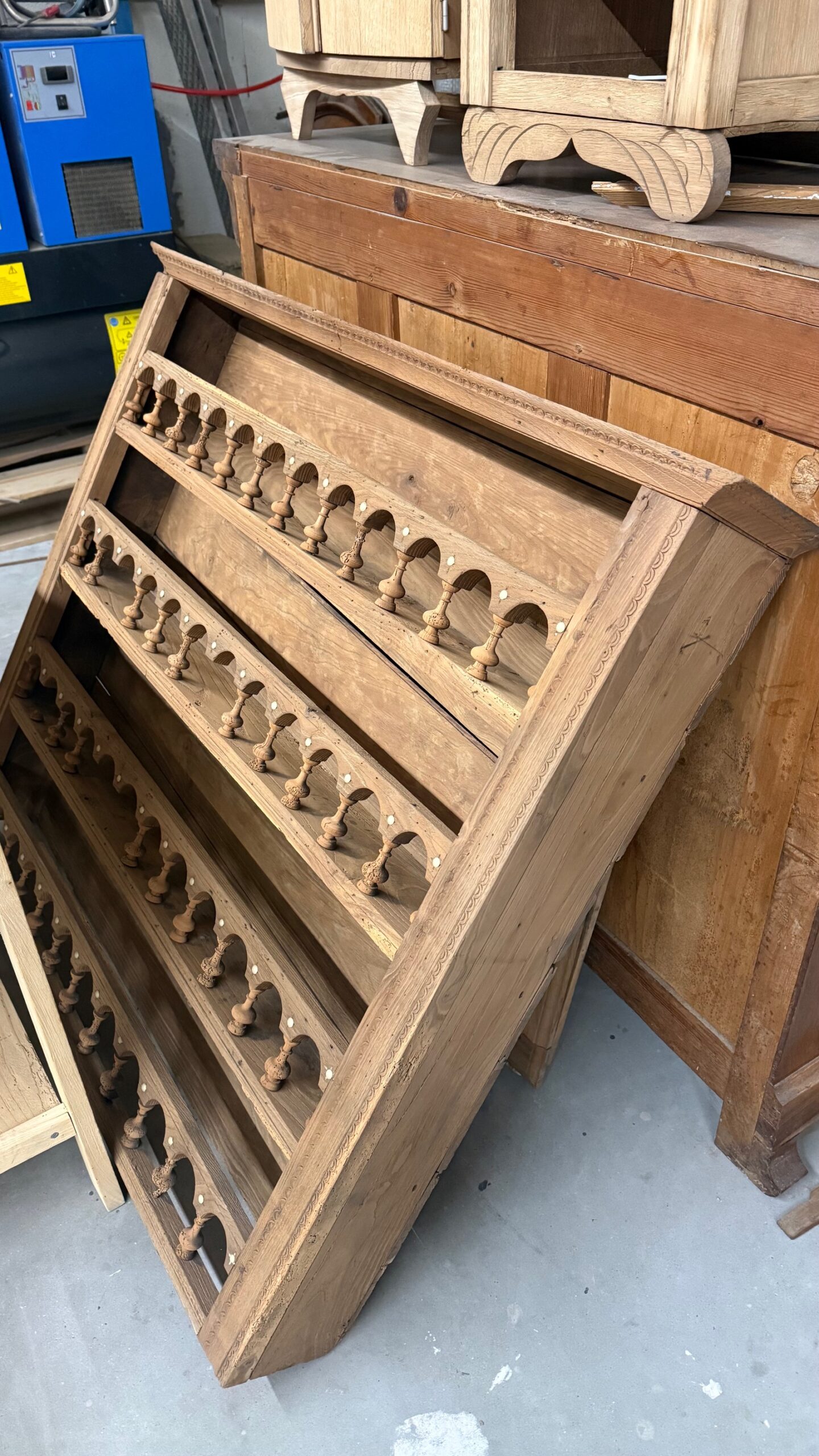 Avant la restauration, le bois était encrassé, les finitions abîmées et certaines parties demandaient des réparations afin de garantir la solidité et la durabilité du meuble.